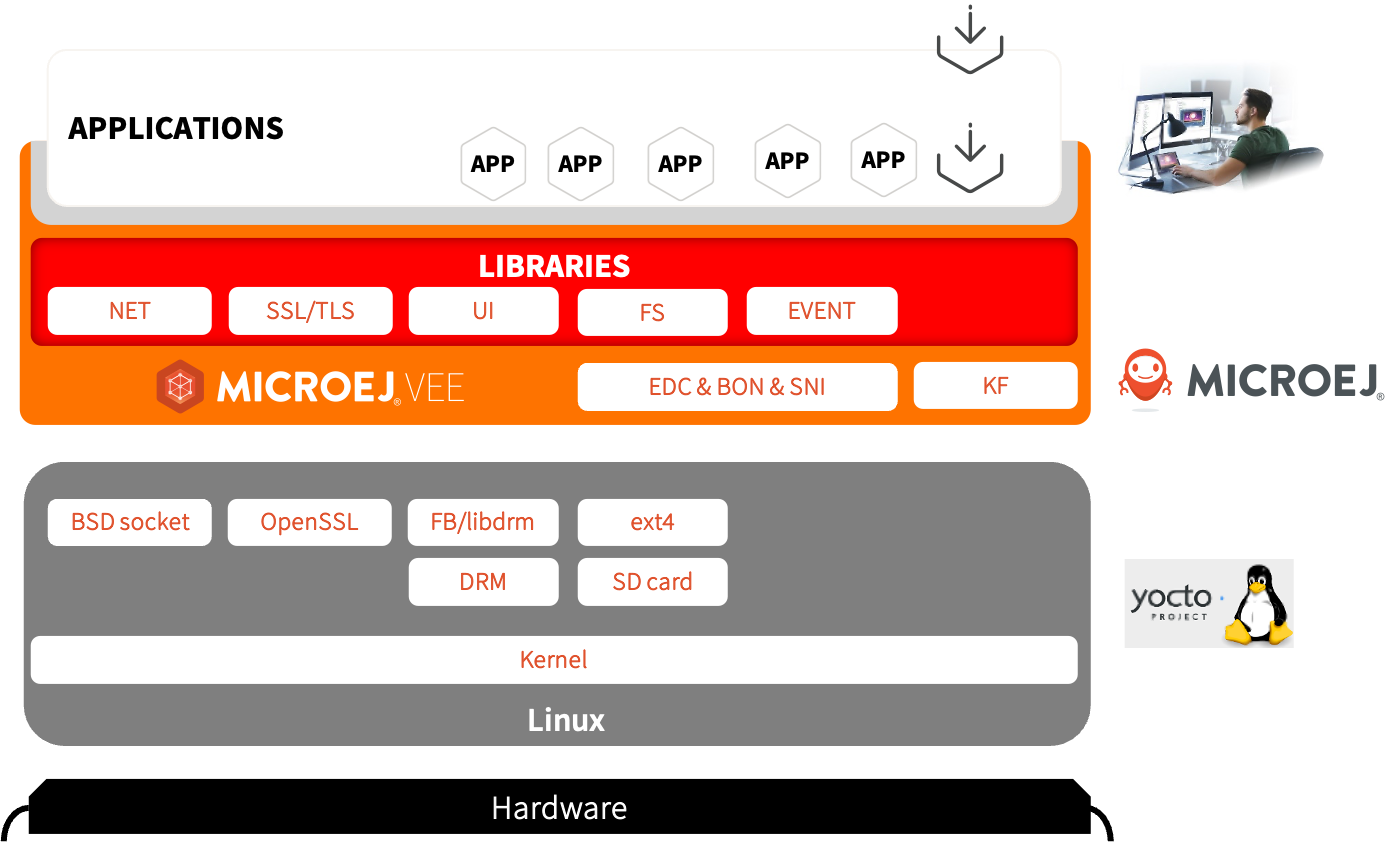 MICROEJ VEE is distributed as an ELF executable along with its native libraries. It can be built, installed, and managed like any standard Linux application. The build system is compatible with any Linux toolchain (Yocto and otherwise, cross-compilation or not). This flexibility enables consistent packaging for custom Linux images and integration across diverse hardware and product variants.