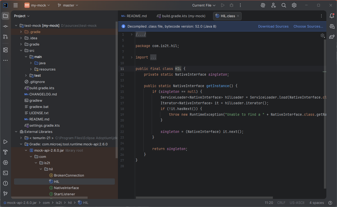 I checked in the MicroEJ module repository, the sources jar is available (https://repository.microej.com/modules/com/microej/tool/runtime/mock-api/2.6.0/mock-api-2.6.0-sources.jar). Is there a way to automatically fetch and use the sources?